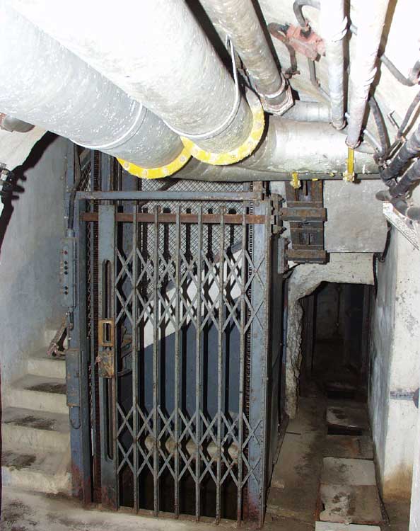COL DES GARDES (111 men) a petit ouverage on the left hand side (going north) of the D22. Block 1 is right by the road but there was no access at this point so we walked to Block 2 the other side of a low hill. This is not a fighting block and consists of little more than a door with one machine gun embrasure covering it. The footbridge over the fosse was missing but we were able to retrieve it from the pit and get across to the open door. A short stairway brought us into a long corridor, at the bottom of the stairs there was a bank of carbon filters that would have been used in the event of a gas attack. At the end of the corridor is a 'T' junction with the main corridor to the fighting blocks, Blocks 3 & 4 to the right and Block 1 to the left. In most Ouvrages the blocks are reached by stairs, often several hundred of them, but at Col des Gardes they were accessed by ladder. Some of our members ascended the ladders but the blocks had been stripped of their light arms and were empty. There are several empty rooms accessed from the main corridor including a number of toilet cubicles, dormitory (caserne) and the generator room (usine). The small single diesel generator is still in place and in good condition.